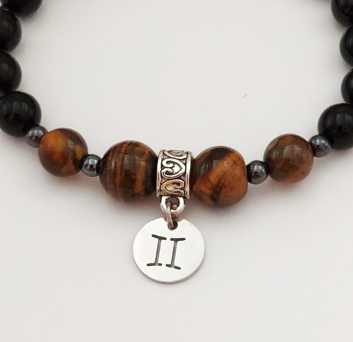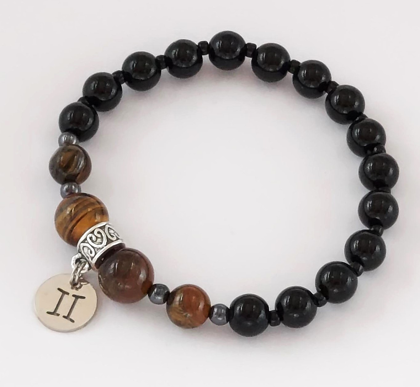 Stone sizes / kivien koko / tamaño de las piedras: 2 x 10mm + 2 x 8mm tiger’s eye / tiikerinsilmä / ojo de tigre; 15 x 8mm blackstone / musta kivi / piedra negra